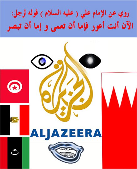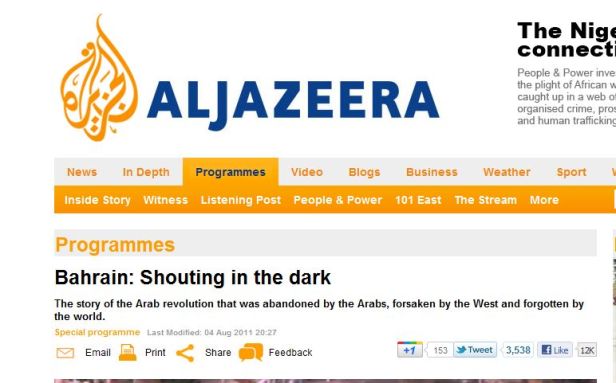 Il est toutefois un espace des printemps arabes sur lequel Al Jazeera reste presque totalement silencieuses: le golfe Persique. Et, plus précisément, la contestation sociale dans le sultanat d’Oman (dans le port de Sohar et, dans une moindre mesure, à Mascate); et surtout la contestation politique et sociale majeur au Bahreïn voisin. Il n’y a eu que d’infimes brèves sur les événements de la place de la Perle à Manama, commencés le 14 février et écrasés par les forces de sécurité locales et une intervention de l’armée saoudienne à partir du 15 mars. Bahreïn devenant ainsi le premier exemple de « contre-révolution » parmi les « révolutions arabes » en cours. Il a donc fallu attendre le 8 août 2011, soit six mois après le début des événements, pour que le canal anglais d’Al Jazeera (mais pas le canal arabe) consacre enfin du long reportage (50 minutes) au Bahreïn. Ce que n’ont pas manqué de relever les caricaturistes….