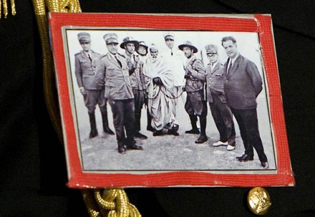 Mais ce qui nous intéresse ici est un détail de décoration des costumes successifs du colonel –on sait qu’il accordait une grande importance au sens politique et symbolique de sa garde-robe, depuis ses uniformes de jeune officier révolutionnaire dans les années 1970 aux djellabas berbères des années 1990 et aux boubous ornés de cartes de l’Afrique dans les années 2000. Kadhafi a porté au revers, tout au long de sa visite officielle en Italie, une photographie en noir et blanc, de la taille d’une carte postale. Il l’a exhibée et commentée lors de toutes ses rencontres officielles. C’est une image iconique de la résistance armée que nous qualifierons pour le moment de libyenne, à la colonisation italienne : elle a été prise le 12 septembre 1931, le lendemain de l’arrestation d’Omar al-Mokhtar par l’armée italienne à l’occasion d’une embuscade dans la montagne. Al-Mokhtar sera jugé en quelques heures par un tribunal militaire spécial, et pendu le 16 septembre devant des milliers de spectateurs réunis par l’armée. Mohamed Omar, le fils aîné d’al-Mokhtar a d’ailleurs accompagné Kadhafi tout au long de son périple italien (on aperçoit d’ailleurs sa silhouette blanche et floue en arrière-plan, entre Berlusconi et Kadhafi). Kadhafi a instrumentalisé la figure d’al-Mokhtar tout au long de son règne libyen, à usage interne, mais peut-être plus encore à destination de ses interlocuteurs étrangers, et bien évidemment tout particulièrement des Italiens (A suivre…)