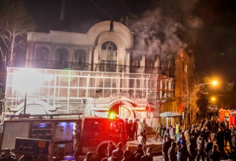 Actualisation janvier 2016: les questions évoquées ci-dessus se posent dans les mêmes termes lorsque, suite à l’exécution du sheikh chiite Nimr al-Nimr en Arabie saoudite, les locaux diplomatiques saoudiens à Téhéran sont attaqués et incendiés le 2 janvier 2016 (photo ci-dessous), et le consulat saoudien à Meched saccagé. Un procès ultérieur condamnera les « émeutiers » de Téhéran, sans que leur sociologie soit clairement explicitée.