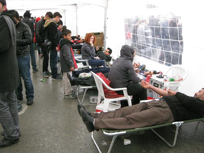Il tombe une pluie froide venue de la mer Noire sur la cérémonie -comme lors des achouras des dernières années, au mois de décembre. Le terrain est boueux, toujours pas aménagé ou empierré. Ecouter debout, pendant trois heures pleines, les discours officiels sera donc une épreuve pour les spectateurs transis, en particulier du côté des femmes venues avec des enfants en bas âge, ou avec des grands-mères. Les petits vendeurs en profitent: aux écharpes colorées ornées de la figure christique de Hussein et aux bandeaux noirs, verts ou blancs au nom du martyr, ils ajoutent quelques parapluies chinois, vite écoulés, et des imperméables légers en plastique, vendus quelques livres. A la pluie et au vent s’ajoute, toutes les deux minutes, le grondement strident des réacteurs des avions qui décollent de l’aéroport international: banlieue majoritairement populaire (et à cet endroit très populaire), Halkalı est en bout des pistes, et en subit les nuisances sonores. Si l’on y ajoute le vacarme du muezzin de la mosquée sunnite voisine qui, pour l’occasion, a sans doute poussé à fond le son de ses hauts-parleurs, on comprend qu’il ne soit pas toujours très facile de suivre les propos des orateurs. Le temps glacial et la durée des discours décourageront d’ailleurs une partie du public, qui abandonnera progressivement les lieux. Avant même la fin de la cérémonie officielle, les tentes du Croissant rouge turc étaient ouvertes pour le don du sang des volontaires: on sait que l’une des principales innovations introduites par Selahattin Özgündüz dans le chiisme ja’fari turc a été de substituer aux rituels sanglants du chiisme un don du sang fraternel. Egalement présente au Liban (mais à Beyrouth plus qu’à Nabatiyeh), cette pratique s’est ensuite étendue en Azerbaidjan, en Iran et, très récemment, au Pakistan et en Arabie saoudite. A Halkalı, de fait, les donneurs ont été nombreux; le don était aussi ouvert aux femmes, mais dans des espaces dissimulés au regard, qui ne permettaient donc pas d’apprécier la fréquentation du lieu. Cette année, le don du sang est fait « au profit des victimes palestiniennes à Gaza ».