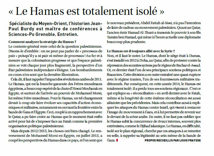 – «La double faute de François Hollande»: tribune-pétition de chercheurs spécialistes de l’Institut de recherche et d’études sur la Méditerranée et le Moyen-Orient (IREMMO) dans Libération le 4 août 4;