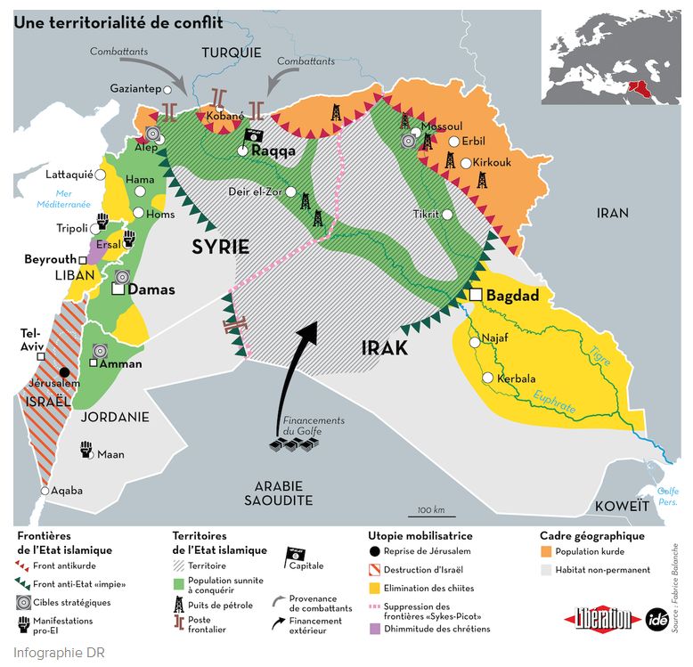 Fabrice Balanche, géographe, directeur du laboratoire GREMMO (Maison de l’Orient et de la Méditerranée, Lyon), grand connaisseur de la Syrie depuis sa thèse sur La région alaouite (2006), décrypte le conflit syrien depuis 2011, dès ses premiers jours. Il a plus spécialement travaillé sur la territorialisation et la cartographie d’une guerre civile et régionale complexe. L’exercice cartographique est tout particulièrement difficile, aux enjeux imbriqués, à la fois spéculatifs et épistémologiques, mais aussi souvent idéologiques, du côté des soutiens ou des ennemis du régime de Damas. Dans Libération du 3 octobre 2014, F.Balanche propose une première carte des dynamiques de territorialisation de l’organisation « Etat islamique », à cheval sur la Syrie et l’Irak : une territorialisation transfrontalière post-Sykes-Picot, qui différencie « Daech » de la matrice déterritorialisée Al-Qaeda.