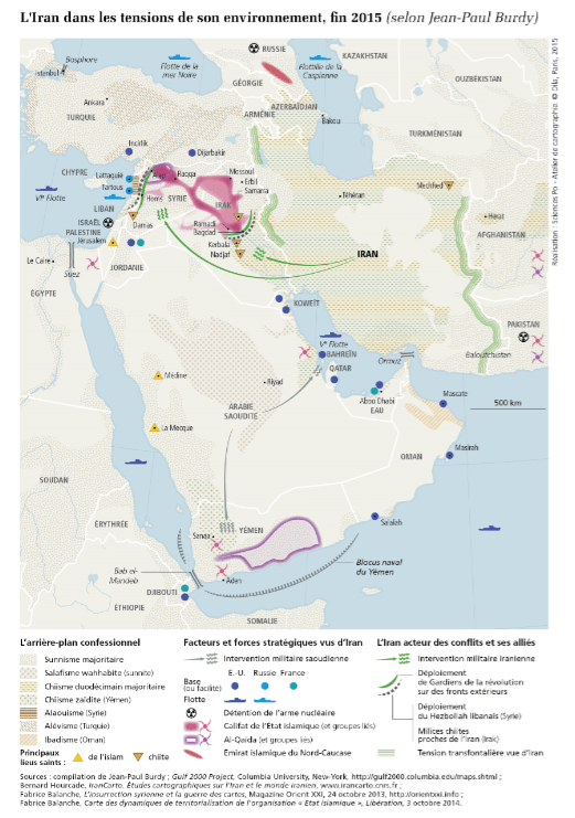 La Documentation française vient de mettre en ligne les cartes de la livraison de Questions internationales no 77, janvier-février 2016, consacrée à « Iran, le retour ». Dont notre carte géopolitique sur « L’Iran dans les tensions de son environnement régional fin 2015 » :http://www.ladocumentationfrancaise.fr/cartes/conflits/c001781-l-iran-dans-les-tensions-de-son-environnement-fin-2015