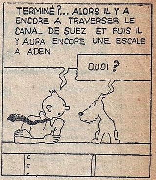 – Tintin au pays de l’or noir, 9e aventure dont la publication juste commencée le 28 septembre 1939 est interrompue dès le 9 mai 1940 par l’invasion de la Belgique par les nazis. Elle reprendra en 1948 dans l’hebdomadaire Tintin et sera, en 1950, le 15e album publié. A peine arrivé dans le port de Haïfa, Tintin est pris dans les affrontements entre Arabes et « Juifs de l’Irgoun » dans la Palestine du mandat britannique : des références historiques qui seront supprimées dans les éditions redessinées en 1971, à commencer par l’édition anglaise. La Palestine mandataire devient un imaginaire Emirat du Khemed. [Les planches originellement parues dans Le Petit Vingtième sont reproduites sur le site : http://www.bellier.org/ornoir%20petit%20vingtieme/vue1.htm ; ainsi que celles de l’édition de 1948 dans Le Journal de Tintin : http://www.bellier.org/or%20noir%201948/vue1.htm]