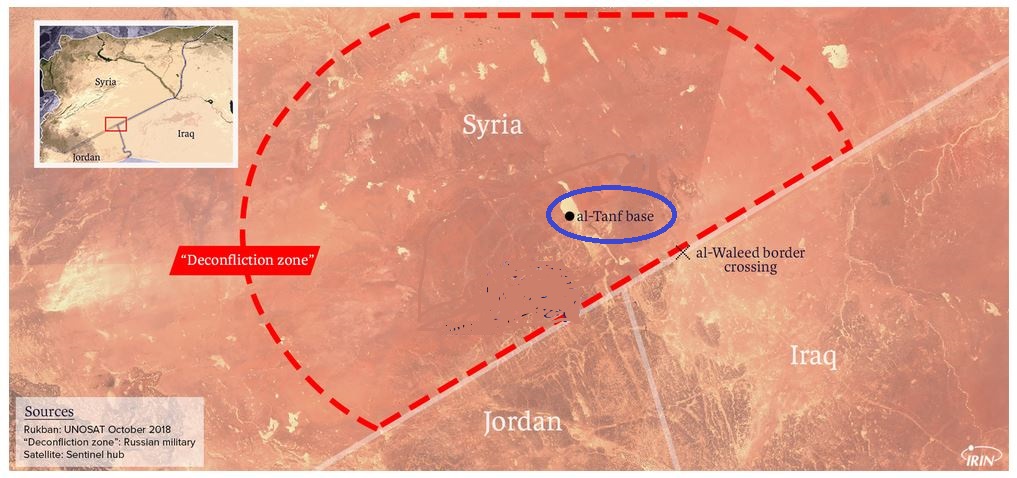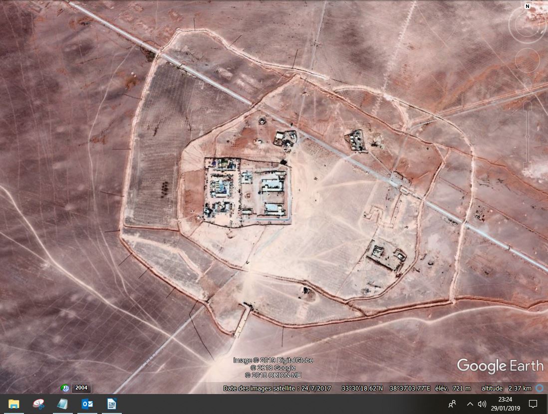 La base américaine d’Al-Tanf (satellite, fin 2017), et sa localisation dans le sud-est de la Syrie (fin 2018)