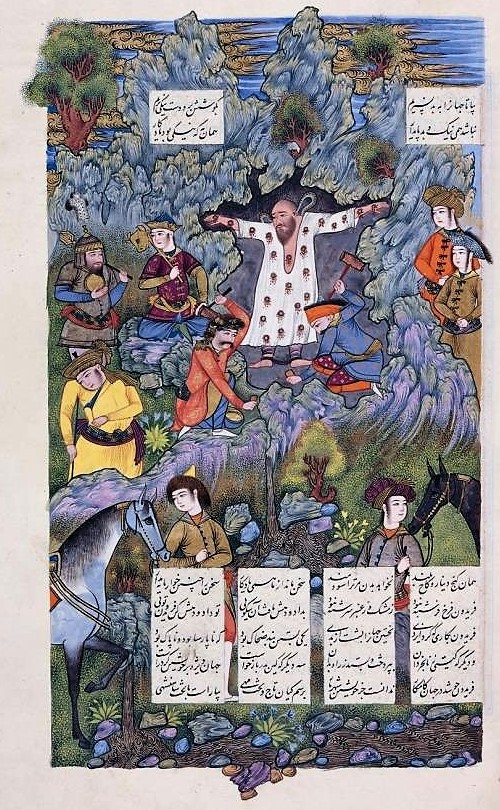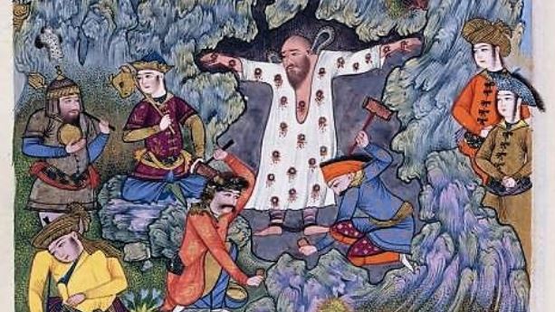 Le tyran Zahhāk enchaîné dans une grotte sur le flanc du Mont Damavand,