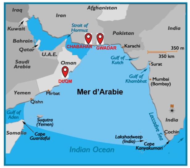Associés à des puissances extérieures, trois Etats riverains du golfe d’Oman et de la mer d’Arabie développent d’ambitieux projets portuaires. Au Pakistan, le port de Gwadar a été pris en main par la Chine. En Iran, l’Inde co-pilote le projet de Chabahar. En Oman, Duqm est placé sous la protection du Royaume-Uni et des Etats-Unis. Ces ports de l’océan Indien ouvrent sur des corridors terrestres transfrontaliers: vers la Chine; vers l’Asie centrale; vers le golfe Persique en contournant le détroit d’Ormuz. Dans une région marquée par des tensions internationales exacerbées, Chabahar, Gwadar et Duqm s’inscrivent dans un nouveau « Grand Jeu .» Mais leur succès paraît inégalement garanti.