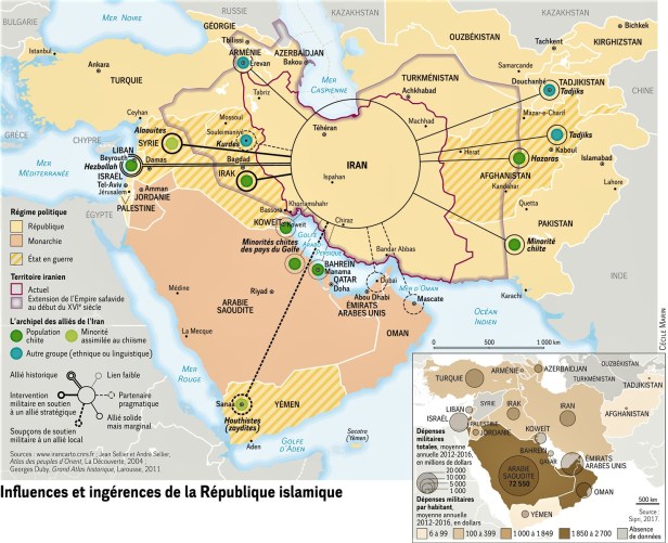 Plutôt que de ratiociner sur « le croissant chiite » (et même si celui-ci a un minimum de réalité historique et confessionnelle, comme l’ont prouvé, par exemple, les travaux de Sabrina Mervin), on se reportera donc plutôt, par exemple, à la carte éclairante élaborée par Bernard Hourcade et publiée dans Le Monde diplomatique de février 2018. L’auteur s’y attache à détailler et à qualifier la complexité des liens entre l’État iranien et son environnement régional.