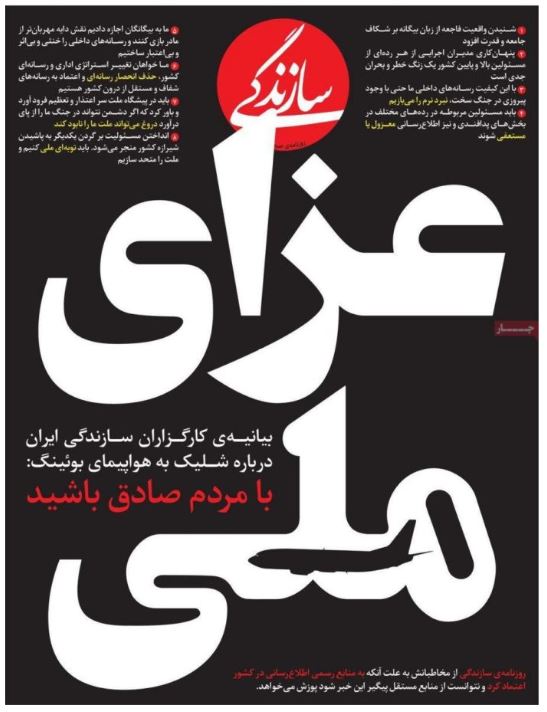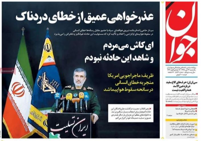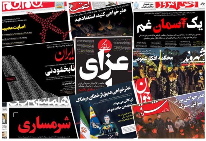 Mais les Unes du 12 janvier tranchent spectaculairement sur l’ordinaire 2. Toutes tendances confondues, elles consacrent leurs titres principaux à la révélation des causes de la chute du Boeing : un (double) tir de missiles iraniens, alors que le discours officiel depuis trois jours évoquait « un accident inexplicable» dont à tout le moins la responsabilité morale était imputable aux pressions américaines sur l’Iran depuis 10 jours. Et niait farouchement toute responsabilité nationale dans la catastrophe. Or les révélations cumulatives des services de renseignement occidentaux, relayées par des enquêtes des médias américains s’appuyant sur des vidéos tournées par des internautes iraniens et diffusées sur les réseaux sociaux iraniens (tout aussi nombreux et efficaces dans leur impact dans la société civile qu’en Occident), ont contraint le régime à reconnaître sa responsabilité pleine et entière.