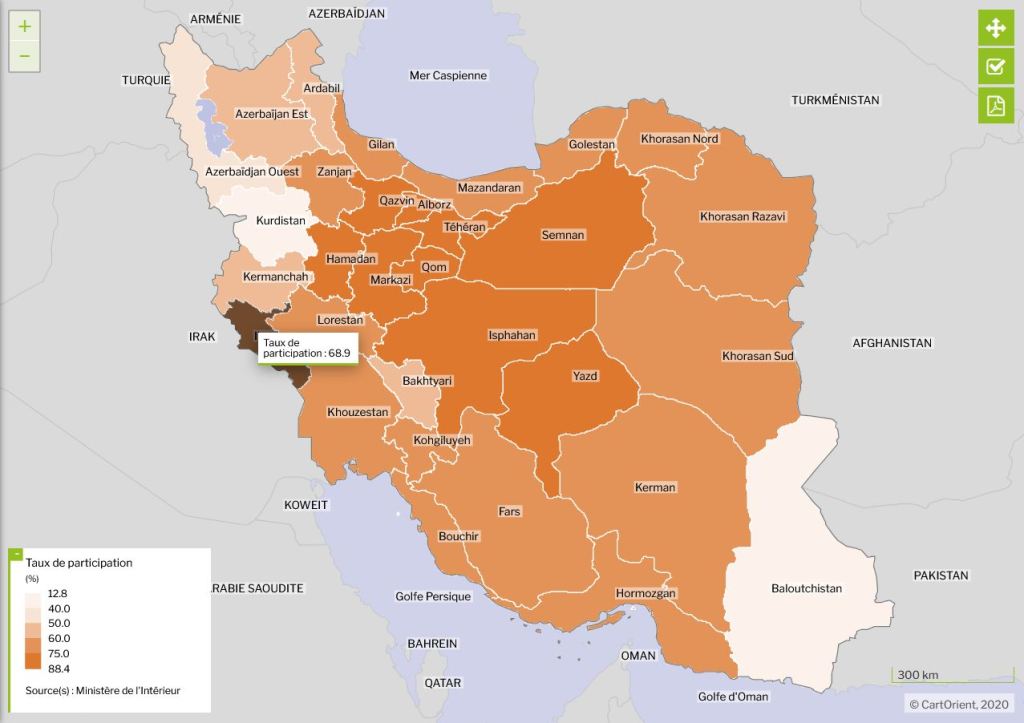 2/ La participation électorale sur le temps long fait ressortir des régions plus abstentionnistes (en gros les périphéries du pays) et d’autres plus régulièrement participatrices (le plateau central iranien). L’abstention peut être un comportement politique construit (Kurdes), autant que le résultat d’appels au boycott par tel ou tel parti ou courant.