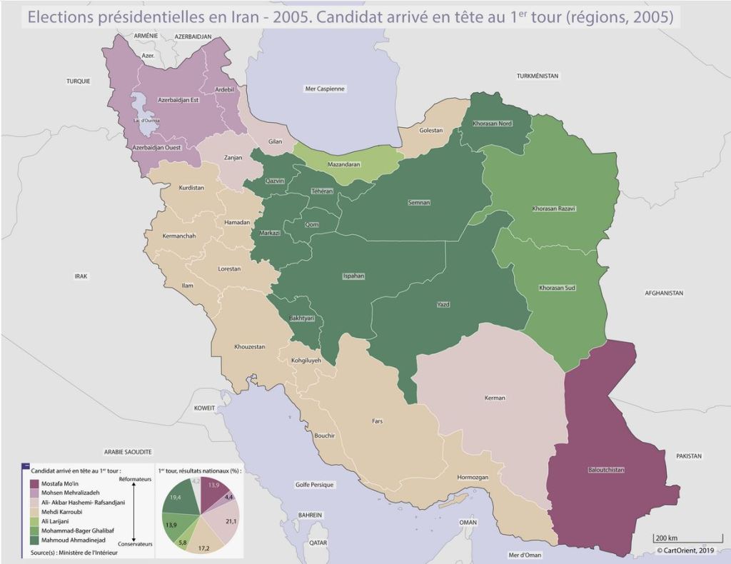 7/ Il y a un facteur localiste net pour tous les candidats. Tout candidat, quelle que soit son appartenance idéologique, bénéficie d’une forte prime dans sa ville/son canton/sa province d’origine. Ainsi en 2005, le clerc « progressiste » Medhi Karoubi a fait le plein des voix dans son Lorestan tribal natal (au sud-ouest).
