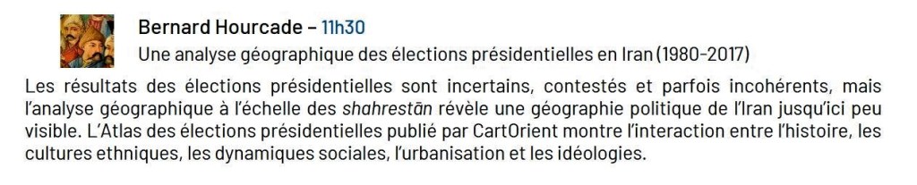 Nous présentons ici quelques notes sur la conférence de Bernard Hourcade 1: « Une analyse géographique des élections présidentielles en Iran de 1980 à 2017 », à la XXIIe journée Monde iranien, Paris, INALCO-CeRMI, le 12 mars 2021