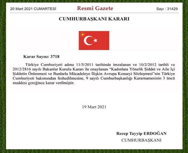 « Türkiye Cumhuriyeti adına 11/5/2011 tarihinde imzalanan ve 10/2/2012 tarihli ve 2012/2816 sayılı Bakanlar Kurulu Kararı ile onaylanan Kadınlara Yönelik Şiddet ve Aile İçi Şiddetin Önlenmesi ve Bunlarla Mücadeleye İlişkin Avrupa Konseyi Sözleşmesi’nin Türkiye Cumhuriyeti bakımından feshedilmesine, 9 sayılı Cumhurbaşkanlığı Kararnamesinin 3’üncü maddesi gereğince karar verilmiştir.«