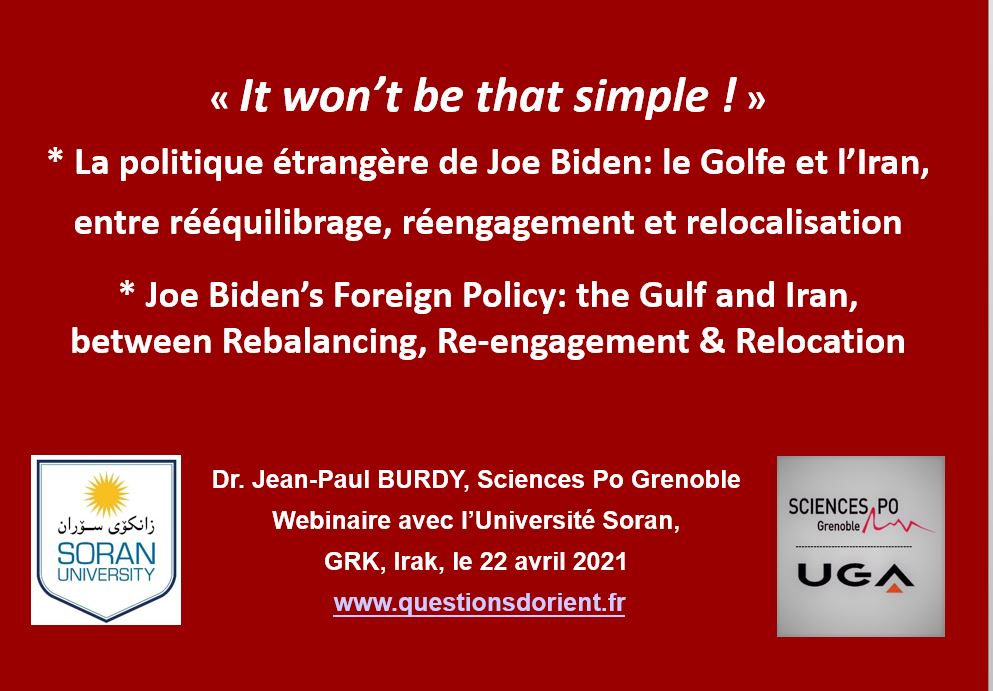 Le 22 avril 2021, l’Université de Soran (Kurdistan d’Irak) et Sciences Po Grenoble organisent un webinaire sur « Le Moyen-Orient à l’heure de Joe Biden », trois mois après l’installation du nouveau président à La Maison Blanche, et un an après qu’il a signé un long texte programmatique dans Foreign Affairs.