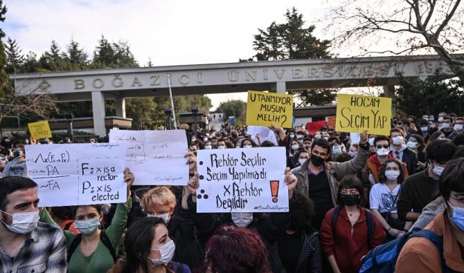 – Une réorganisation du YÖK qui donne à Erdoğan le monopole politique de la nomination des recteurs, sans plus tenir compte des titres académiques des nommés, ou des prises de position des sénats des universités. La crise la plus emblématique a été, début 2021, celle de la nomination d’un nouveau recteur à la tête de l’Université du Bosphore (anglophone, une des plus importantes et prestigieuses d’Istanbul, sur la rive asiatique) : Melih Bullu, au CV académique très limité, mais militant AKP. Sa nomination a provoqué une mobilisation de plusieurs mois de la quasi totalité du corps professoral de l’Université et de milliers d’étudiants. Ces derniers se sont, en particulier, fait traiter de « LGBT inspirés de l’étranger », « vendus à l’Occident », etc., ce qui plaît à l’électorat AKP. Finalement le régime l’a emporté au prix d’une purge dans le personnel enseignant (les licenciés sont remplacés par des enseignants de l’AKP) et étudiant. Les manifestations de solidarité dans de très nombreuses autres universités publiques dans tout le pays n’y ont rien fait.