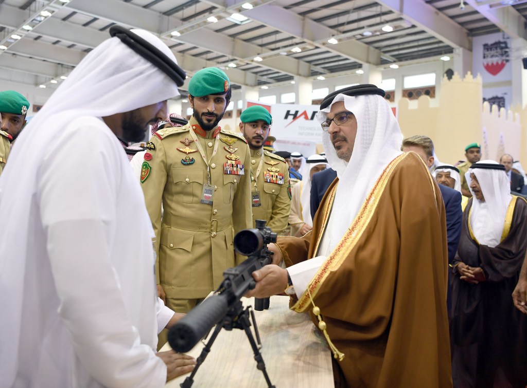 Le prince héritier Salmane (à droite) et son demi-frère « Sheikh Nasser » (de face) à un salon de l’armement en 2019