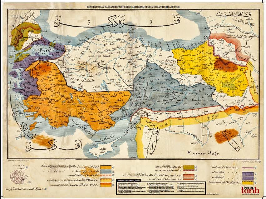 Effectivement, les zones délimitées et colorisées ne se superposent pas à la carte de la République de Turquie, et à ses frontières contemporaines. Et, comme l’ont immédiatement souligné les éditorialistes des médias aux ordres du pouvoir, désormais largement hégémoniques dans le pays, tout cela ressemble fort à la carte du traité de Sèvres du 10 août 1920. Honni des nationalistes turcs dès le premier jour, celui-ci, envisagé par les Alliés après l’effondrement de l’Empire ottoman en 1918, et avant la guerre de libération nationale de Mustafa Kemal (Atatürk) entre 1919 et 1922, prévoyait le démantèlement de l’Anatolie au profit de plusieurs bénéficiaires (les Grecs, les Arméniens, peut-être les Kurdes, et surtout les Anglais, les Français, et les Italiens). De plus, les mêmes éditorialistes ont également abondamment souligné que « les frontières dessinées sur la carte sont similaires à la soi-disant carte du Kurdistan du groupe terroriste PKK» , frontières « visant à amputer la Turquie », et qui ont « toujours été encouragées par les impérialismes occidentaux. »