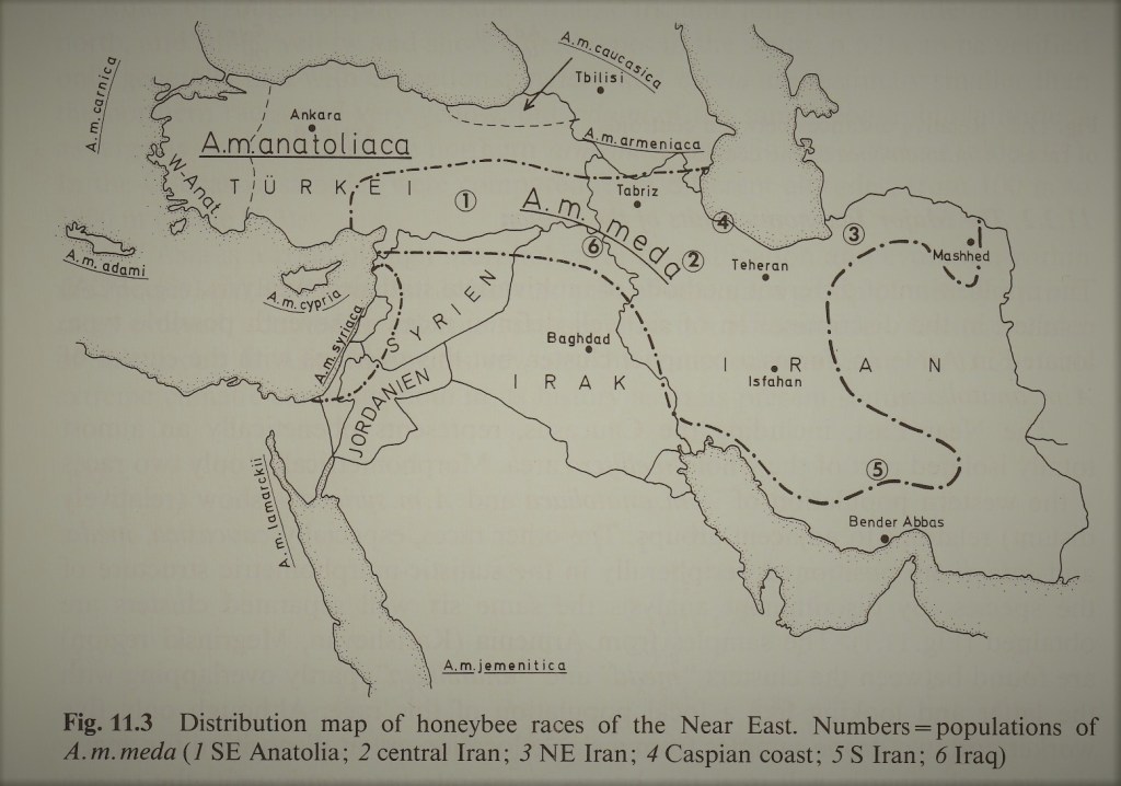 3) Apis mellifera meda (Iran Arısı, « l’abeille iranienne ») , du golfe d’Adana au nord de la Syrie et à l’Iran ;