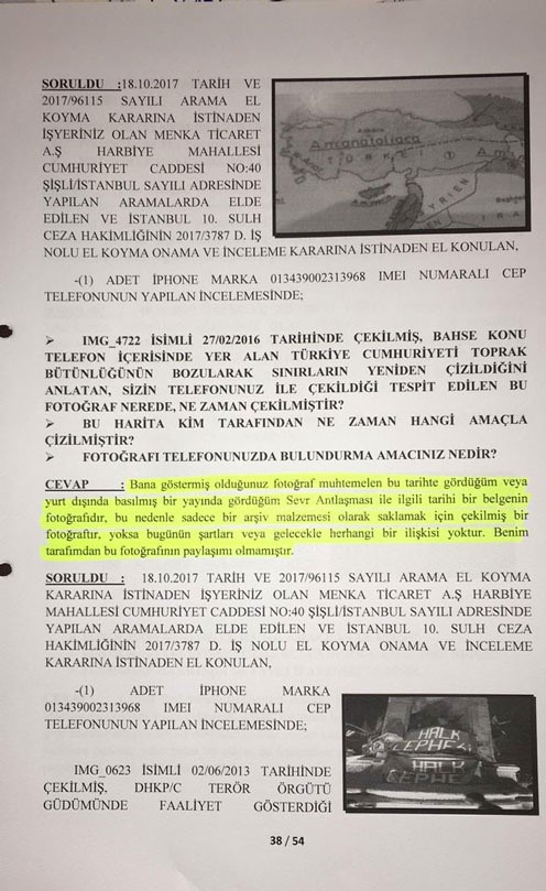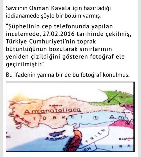 On peut donc lire, dans un extrait des interrogatoires policiers initiaux de Kavala en 2017, à côté de la capture d’une carte en couleur : « Un examen du téléphone portable du suspect a révélé que la photo prise le 27/02/2016 l’a été avec le téléphone portable du suspect. [On y observe que] l’intégrité territoriale de la République de Turquie y est remise en cause, et que les frontières ont été redessinées …» (#2). La carte en question est également présente dans l’acte d’accusation de 2019.