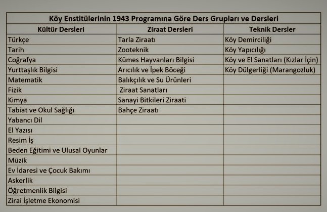 Köy Enstitülerinin ders programı incelendiğinde derslerin (1) Kültür ; (2) Teknik (3) Tarım:
