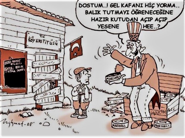 Caricature de 2008 (auteur inconnu) montrant les Etats-Unis offrant les boîtes de conserve du Plan Marshall à un jeune Turc se heurtant à la porte fermé de son Institut de village en 1954. [Traduction: « Garçon, viens, ne te prend pas la tête ! Pour apprendre à pêcher, il suffit d’ouvrir la boîte et de manger le poisson…« ]