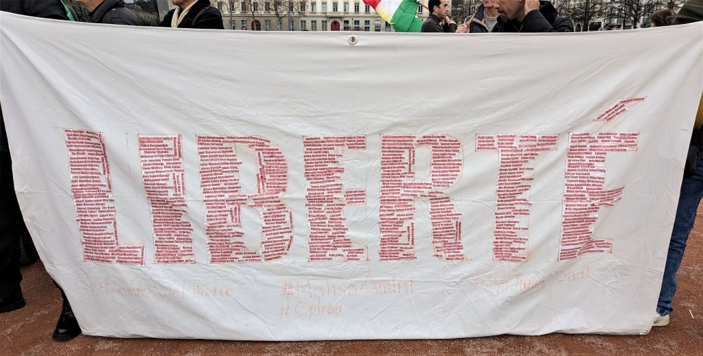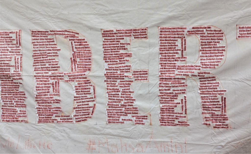 Une bannière réunissant les noms de quelques 500 victimes de la répression en Iran depuis le 16 septembre 2022