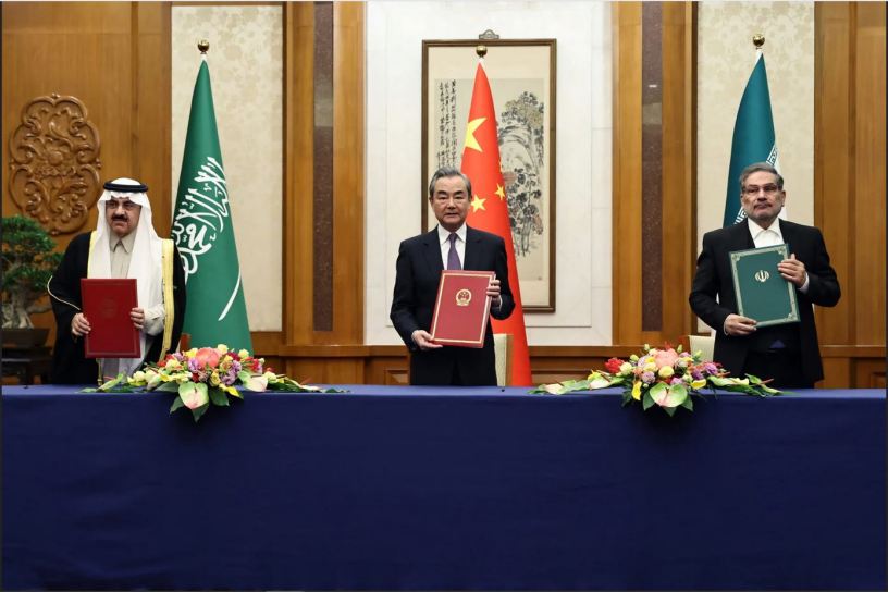 « Au royaume des dictateurs, l’opportunisme est roi. Ainsi pourrait être interprétée cette nouvelle incroyable : le 10 mars 2023, la Chine a réussi à faire s’asseoir les deux géants du Moyen-Orient autour de la même table pour leur faire signer une réconciliation formelle. L’Arabie saoudite et l’Iran étaient sans relation diplomatique depuis janvier 2016 […] Ce même 10 mars, Xi Jinping voyait son mandat de président de la République populaire renouvelé et se présentait comme un « homme de paix » […] Peu habituée à gérer les crises politiques du Moyen-Orient, la Chine s’engouffre ainsi dans le vide laissé par les Etats-Unis pour se présenter comme puissance médiatrice. ».