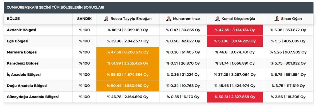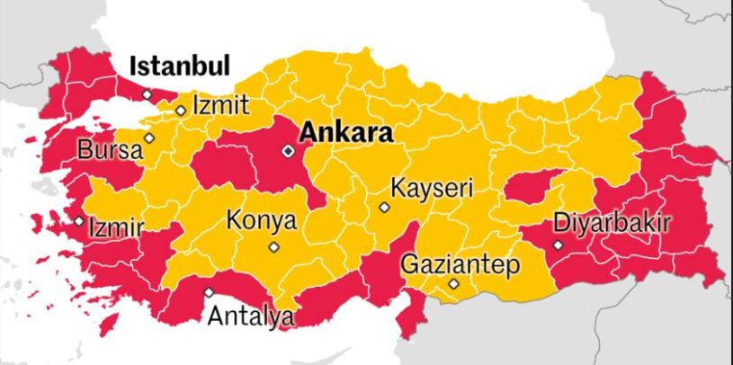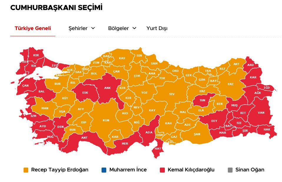 Une géographie électorale habituelle pour les principales forces politiques: les côtes méditerranéennes et le « sud-est » à majorité kurde pour Kılıçdaroğlu ; et le plateau anatolien et la mer Noire pour le sortant Erdoğan…