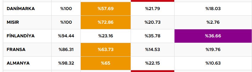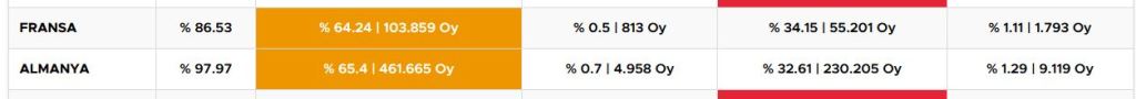 Les résultats (provisoires) pour les législatives au Danemark, en Egypte, en Finlande, en France et en Allemagne. Le jaune est pour la coalition pro-Erdogan, le rouge pro-Kılıçdaroğlu; le violet correspond au vote dit « pro-kurde »