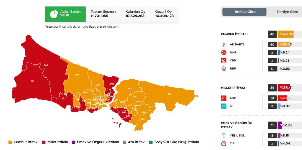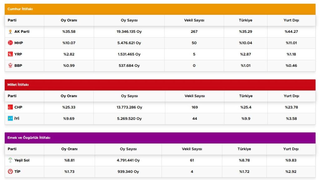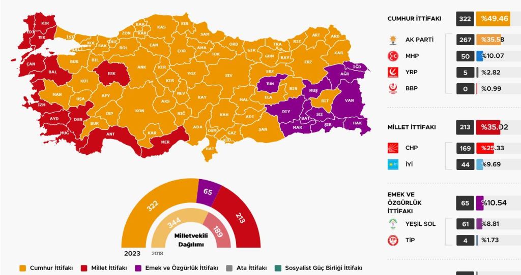 – la coalition erdoğaniste Cumhur Ittifaki (AKP-MHP-YRP- en jaune), bien qu’en recul par rapport à 2018, obtient la majorité absolue avec 49,46 % des suffrages et 322 députés . L’AKP perd des plumes, mais le MHP se renforce.