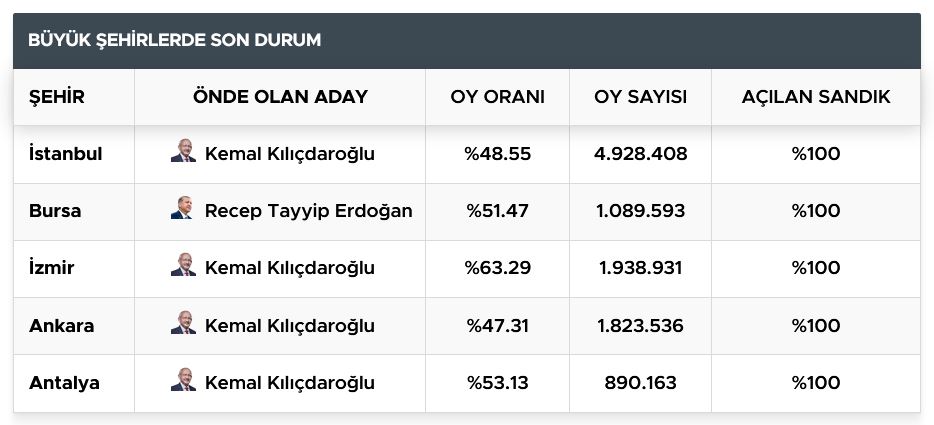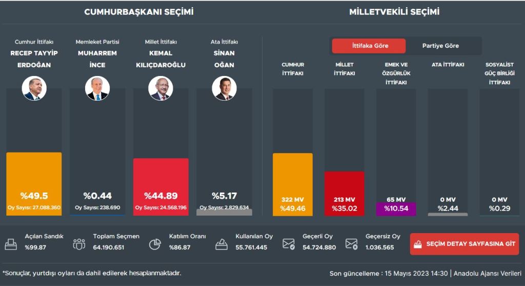 Pour la présidentielle, le sortant Recep Tayyip Erdoğan obtient 49,5 % des suffrages, devant Kemal Kılıçdaroğlu – 44,89 %. Le « troisième homme », le nationaliste d’extrême-droite Sinan Oğan (d’origine azérie, ultranationaliste et violemment anti-kurde et anti-arménien) obtient 5,17 % des voix – qui se pourraient se porter plutôt vers Erdoğan. Celui-ci est donc a priori en position très favorable pour le deuxième tour. L’une des leçons de ce premier tour est que les multiples sondages qui donnaient une avance de plusieurs points à Kemal Kılıçdaroğlu, voire sa victoire dès le premier tour, se sont assez lourdement trompés. Et les espoirs de nombreuses chancelleries européennes d’un changement significatif à Ankara sont d’ors-et-déjà déçus. On n’oubliera pas les innombrables prisonniers politiques, et les exilés, pour lesquels la perspective d’une amnistie annoncée par le candidat Kılıçdaroğlu s’éloigne.