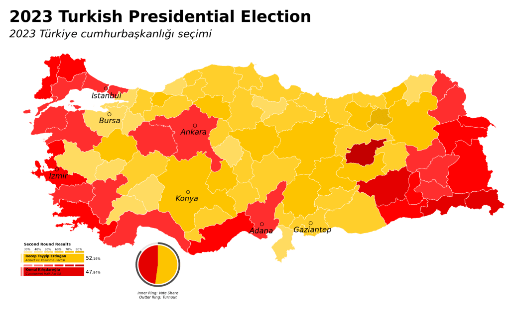 Carte du deuxième tour de la présidentielle, le 28 mai 2023 (les nuances de rouge renvoient au candidat d’opposition Kılıçdaroğlu; de jaune au candidat sortant Erdoğan)