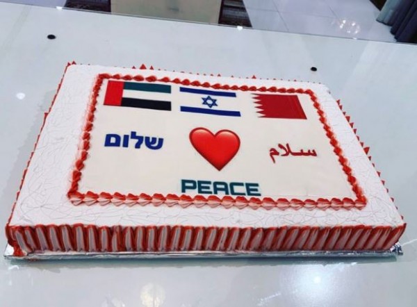Un « gâteau de la paix » confectionné à Muharraq (Bahreïn) en 2020, à l’occasion de la signature des accords d’Abraham: son commanditaire s’en est excusé le 16 octobre 2023, au nom de son soutien à la cause palestinienne.