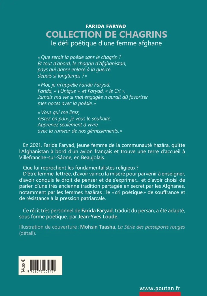Référence : « Collection de chagrins – le défi poétique d’une femme afghane » . Un récit-témoignage de Farida Faryad, préfacé et adapté sous forme poétique par Jean-Yves Loude, Gleizé, Editions du Poutan, sept.2024, 96p.