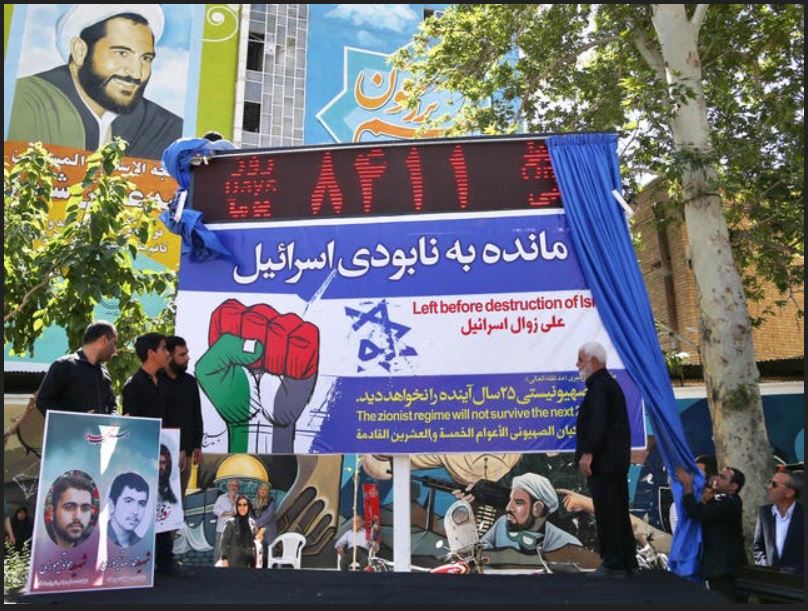 Téhéran, place de la Palestine: l’horloge numérique installée en 2017 et affichant le compte-à-rebours devant mener à la destruction d’Israël, au plus tard en 2040…