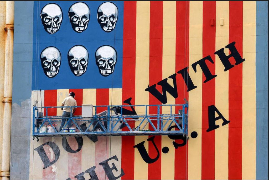 Téhéran, avenue Karim Khan Zand, mars 2025: la célèbre peinture murale de 2006 « Down with the USA » est remise en peinture.