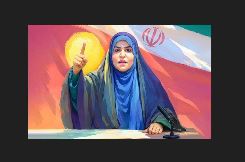 Affiche du site officiel khamenei.ir évoquant la speakerine de la télévision iranienne lors de son bombardement en direct par les Israéliens le 13 juin 2025.