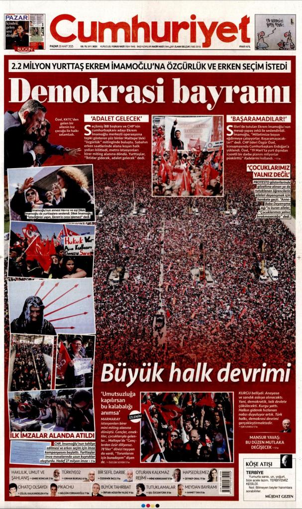 La Une du Cumhuriyet, organe du CHP (opposition) le 30 mars 2025, sur les manifestations après l’arrestation d’Imamoglu