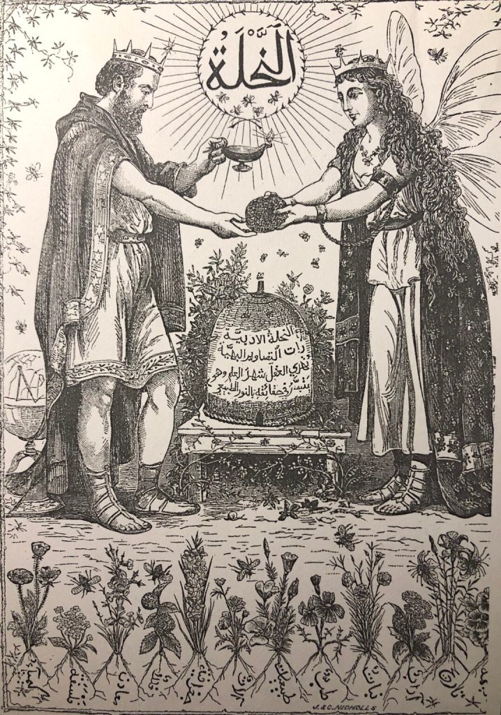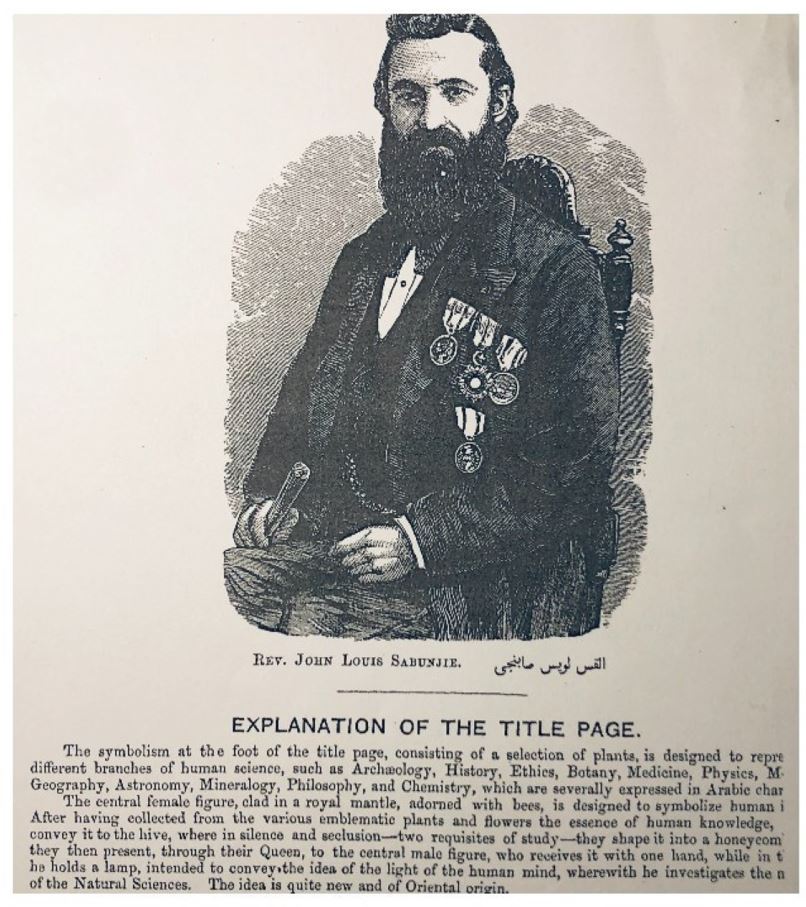 [2] SABUNJI John Louis [1877], « Al-Nahle – Explanation of the Title Page », gravure introductive, Al-Nahle, July 1, 1877, no1. Les quelques mots demi-manquants en fin de ligne ont été restitués par un logiciel d’intelligence artificielle.
